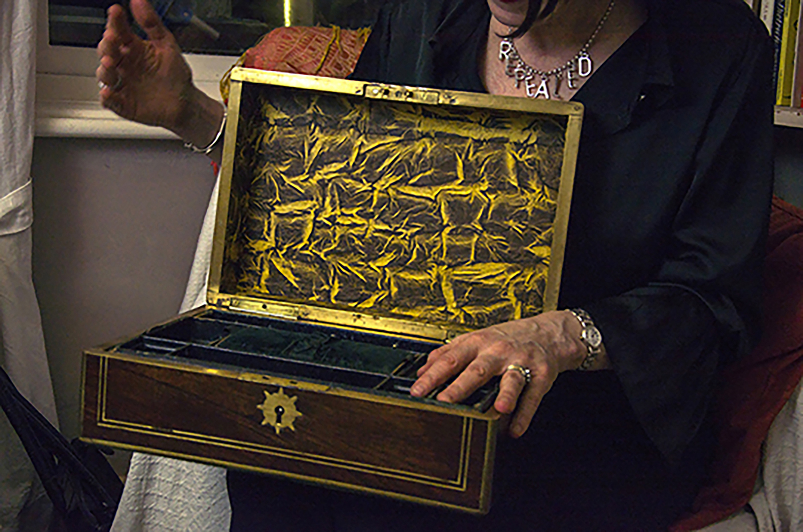 she pointed to the box, which was sitting on her dressing table and asked me to bring it over and then with quite a degree of formality handed it over to me but said “this is for you and Colin”