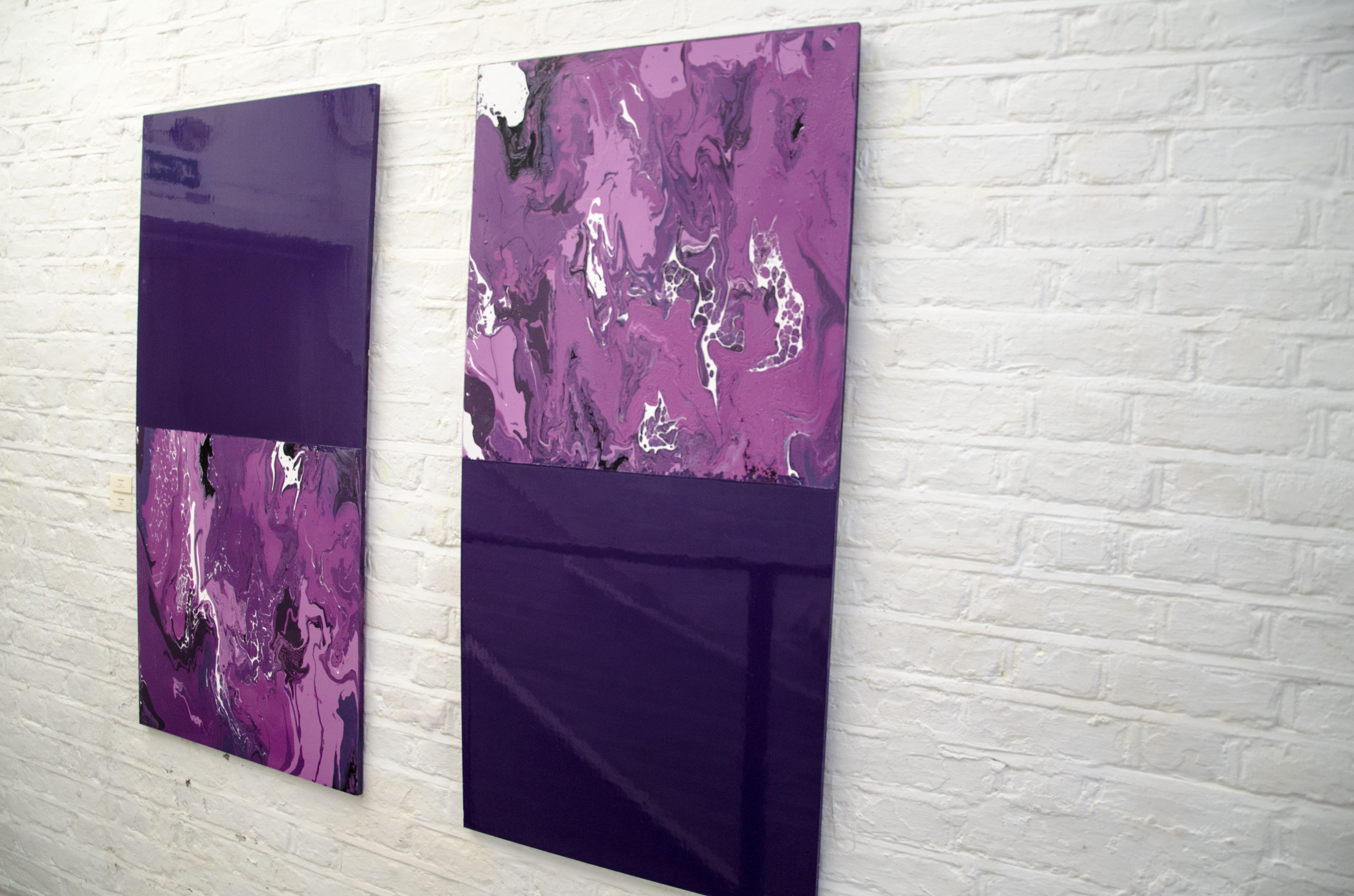 Adam Spain’s large scale emulsion paintings installed on the landing between the upper and lower floors of the gallery lend a sense of flow to the audience, drawing the eye through the bright purple coloured paintings and down the stairs to the lower floor. King and Queen are painted in vivid regal purple, adding a pop of colour to the space.
