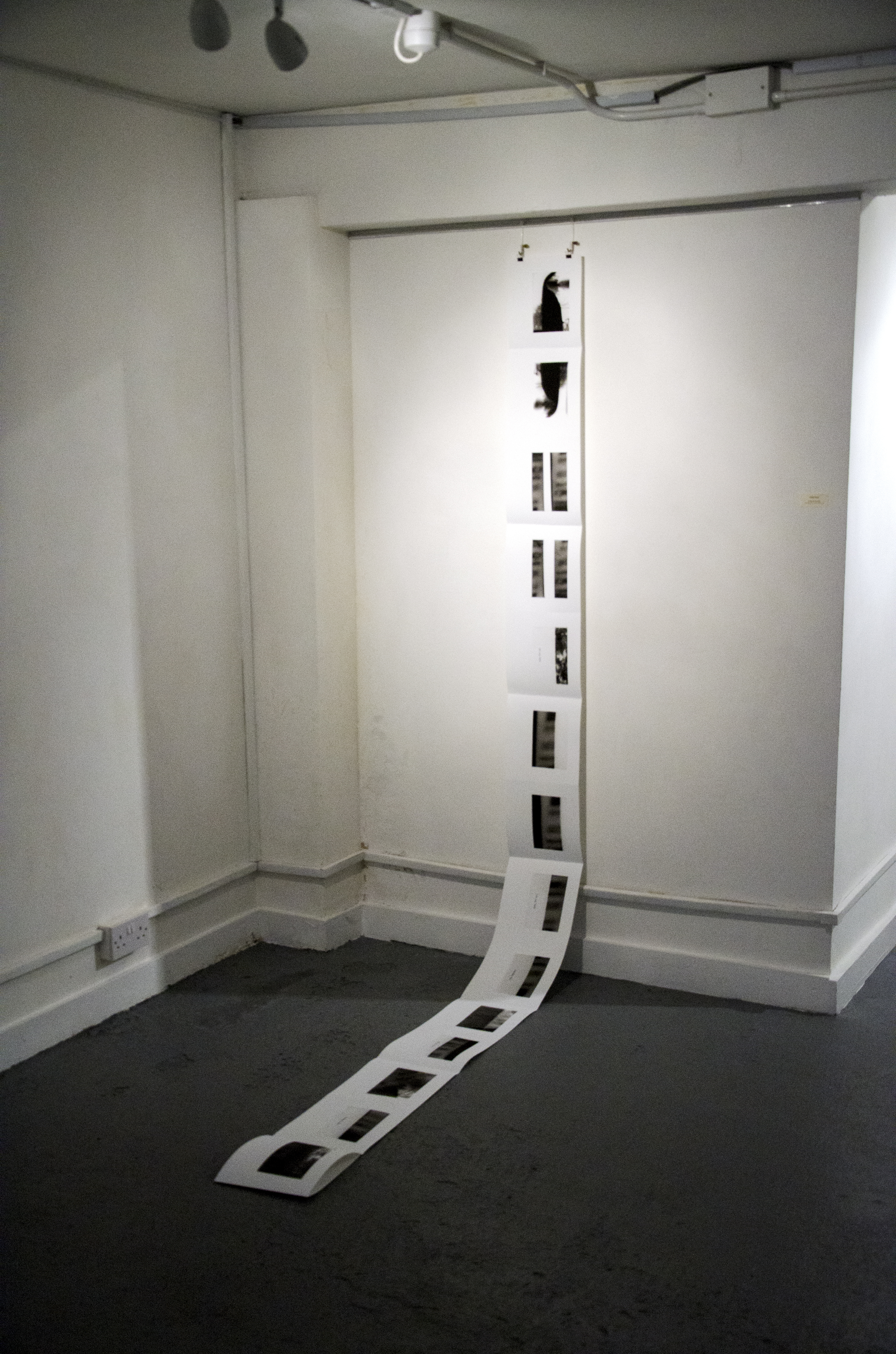 In the other alcove at the back of the lower space is Robin Clarke’s Untitled, acetate overlaid photographs of railway bridges and street corners. These pieces add a pop of colour to the otherwise bare white wall of the enclosed downstairs space.